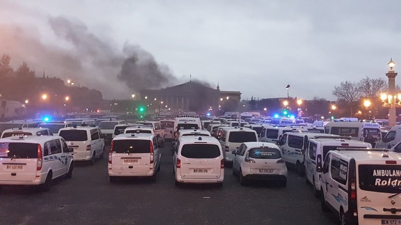 Plusieurs centaines d’ambulanciers convergent en direction de la place de la Concorde Ă Paris et doivent ensuite rejoindre le boulevard pĂ©riphĂ©rique pour bloquer les voies. Rejoints par les taxis, ils manifestent contre la loi de Finance 2019.