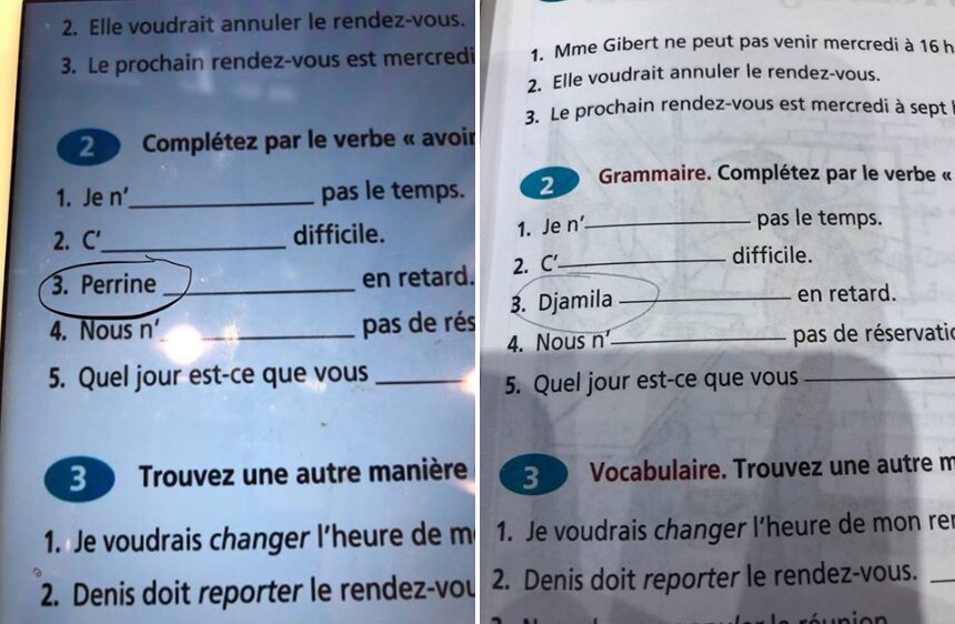 Dans le même exercice, entre l’édition 2006 et l’édition 2012, « Perrine » est devenue « Djamila » 😂 De quoi motiver les étrangers : apprends le français pour communiquer avec les arabes ! 🤣